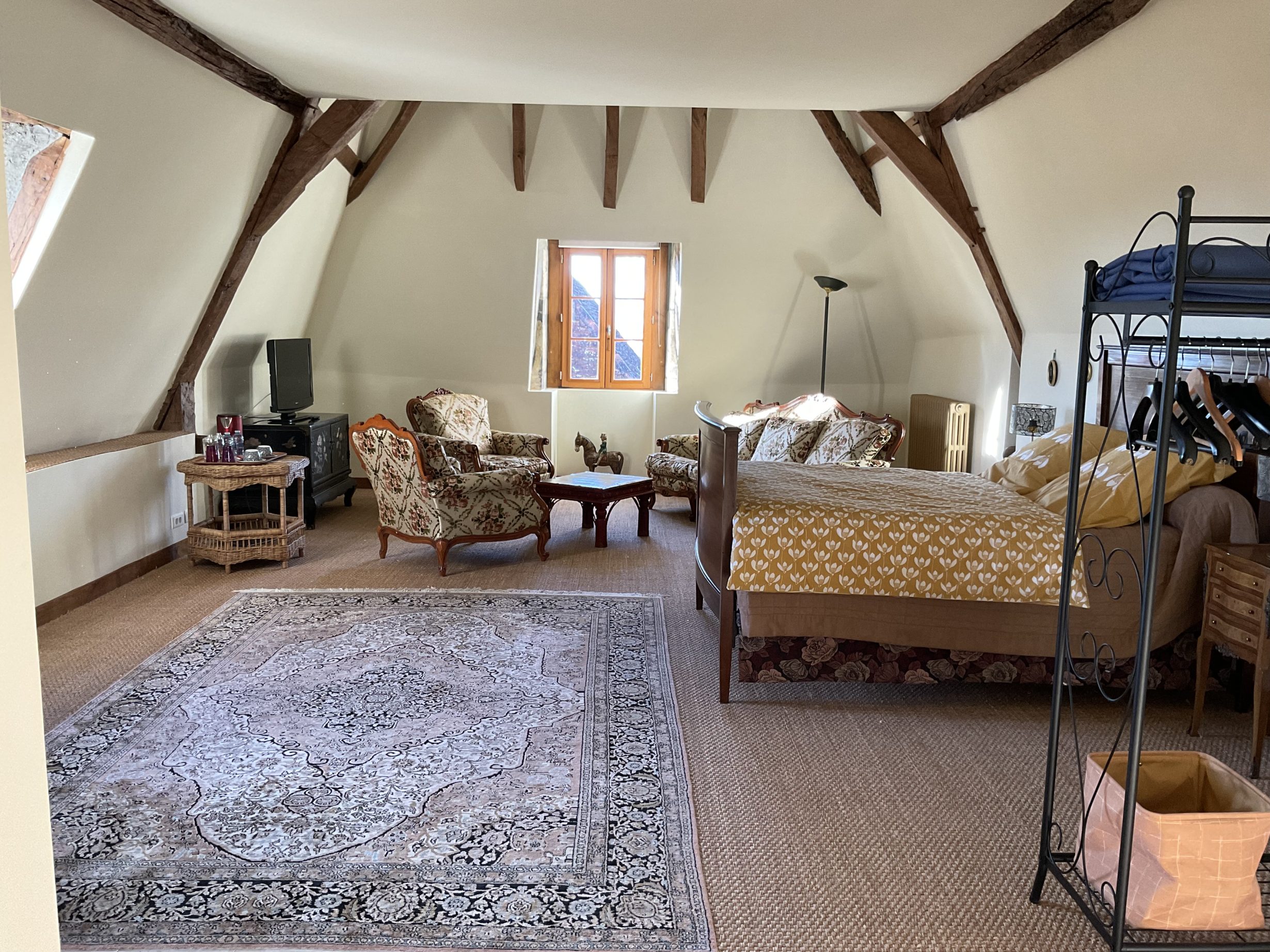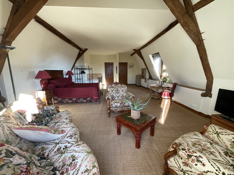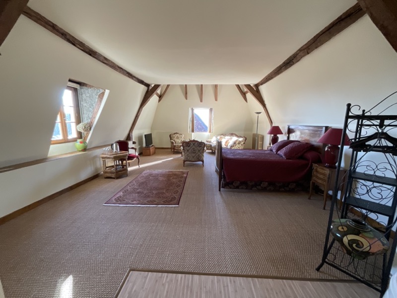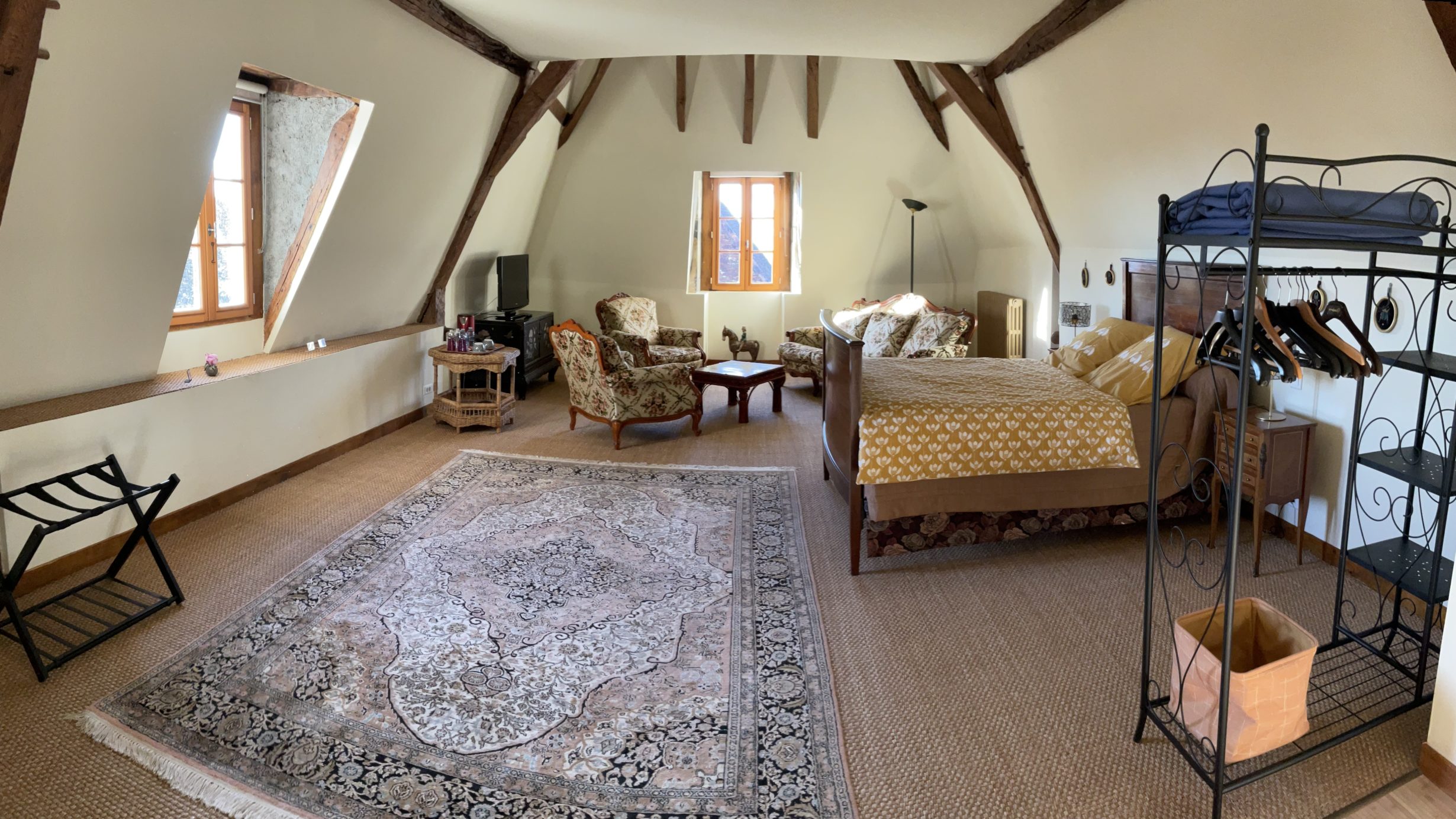 Chambre à coucher sous magnifique charpente en bois avec vue dégagée sur le parc.